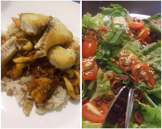 theme for weekend number two was seafood and once again, ingenious pak law managed to cook up quite a unique one dish meal. it was one of his few attempts at fusion and this girl would like to commend him on the pretty good job done! the concoction was a homemade mix of brown and glutinous rice with bits of chinese sausage topped with stir fried garlic prawns and calamari and slices of cod fillet. it was a fantastic combination of chinese and somewhat italian flavours of sweet and salty...and dinner was made complete (almost actually..minus dessert) with mom's homemade salad drizzled with freshly made sesame dressing.